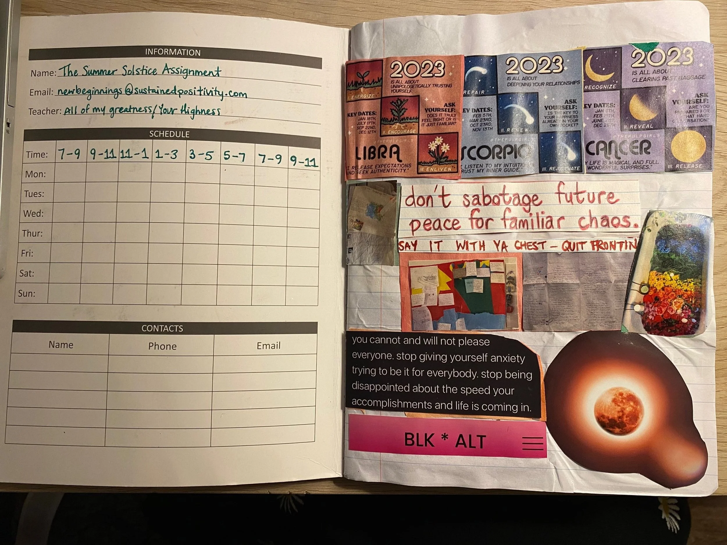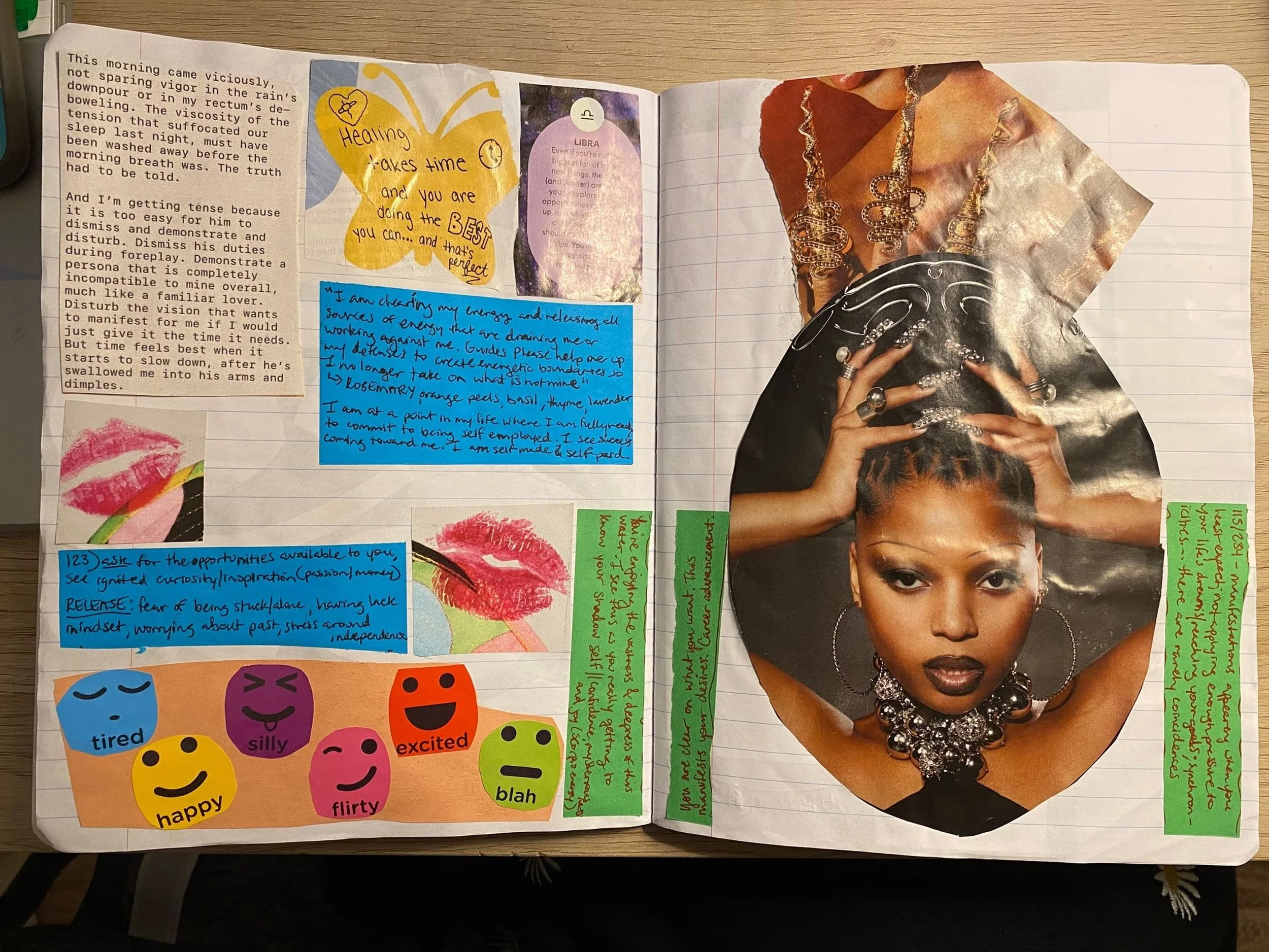 When this journal started, I didn’t think of it as a junk journal. I still don’t, since I’m quite intentional with what I include. I keep fragments of life and snippets of media that remind me how far we’ve come & still got to go. The poem on the left side came from a rough morning with a mismatched partner. The blue and green pieces of paper were horoscopes from Twitter & Youtube that resonated. The cutouts are in tune with my Slytherin leadership style and Libra sun. Like Agent Smith said in The Matrix Reloaded, as he made another clone: “Me, me, me.”